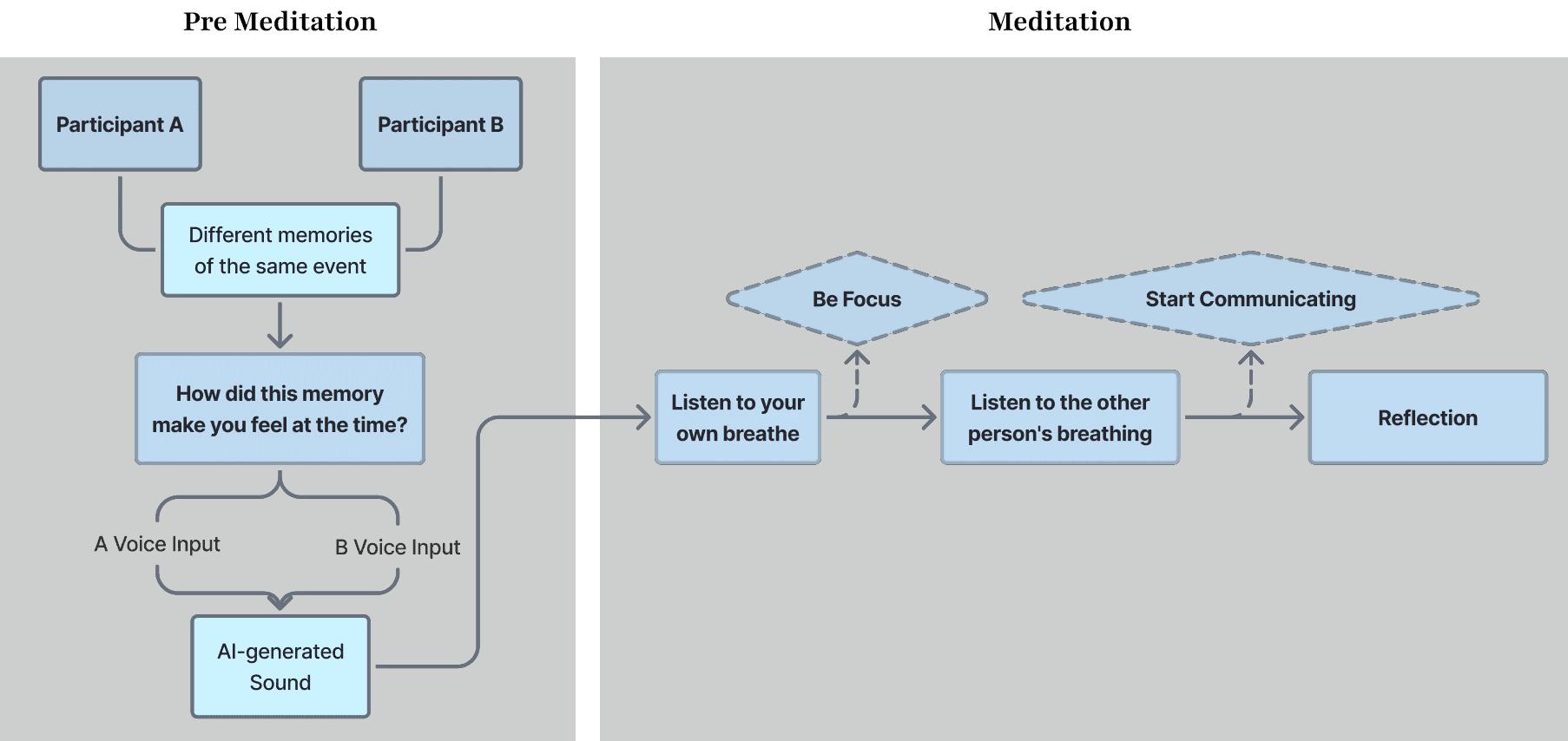Participants enter the experience with a shared memory and participate in a guided meditation while their narrated memories create a soundscape. Synchronization appears as a type of nonverbal negotiation between emotional states through listening to liquid instead of words.