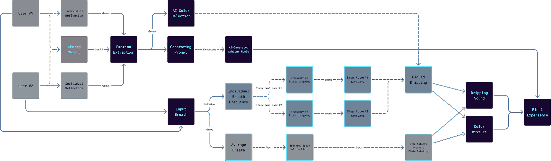 Droplets of Sati is an interactive two-person meditation system investigating liquid as a common interface for nonverbal communication. Through converting participants’ breathing rhythm into dripping liquid, the system enables each person to gradually come into contact with the other person’s rhythm after attuning to their own physical tempo.