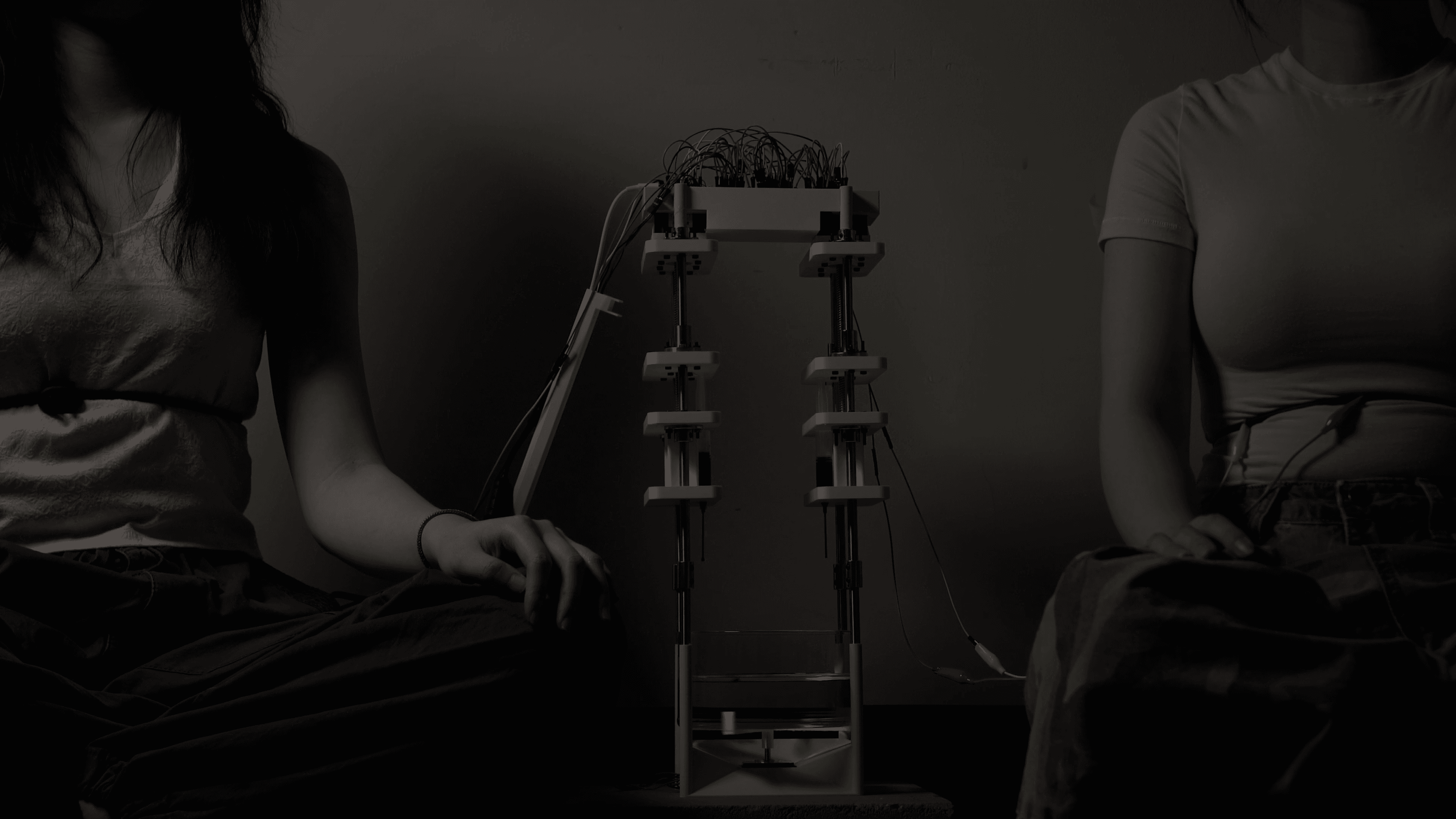 Participants sit across from the liquid interface, wearing respiratory sensors that translate breathing into discrete droplet events. In the initial self-attunement phase, each participant hears only their own droplet rhythm, allowing them to ground attention in personal respiratory tempo through synchronized sound and liquid motion.
