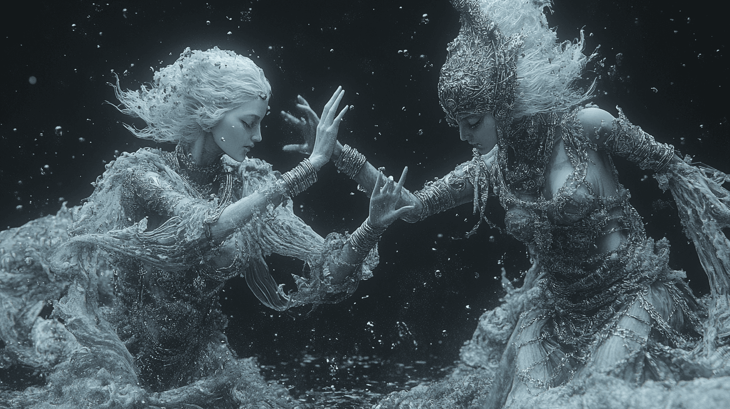 Transition between generation of goddess: The older generation of shaman goddesses passes her power to the new generation of goddesses through dance and motion.